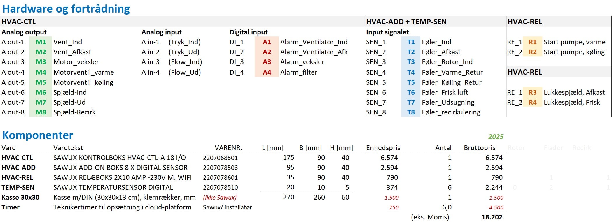 HVAC-CTL, kontrolboksen har en række analoge (0-10 V) og digital ud- og indgange til styring og overvågning af af komponenter. Den kan benyttes til styring af ventilatorer, rotor og motorventil.