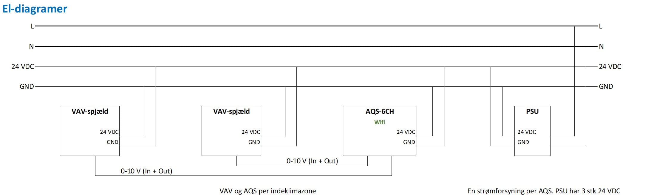 PSU strømforsyning (24 VDC) med tre udgange kan benyttes til forsyning af både AQS og VAV-spjæld.