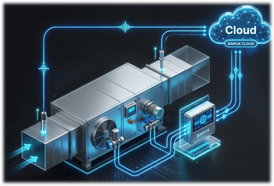 HVAC-ADD + TEMP-SEN måler temperatur relevante steder. Wifi opkobling til cloud-platform for opsamling af målinger.